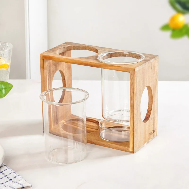 The Country Charm Wooden Cutlery & Tumbler Stand features a sturdy wooden build with a rustic, elegant finish that beautifully organizes your kitchen essentials while adding a warm and charming touch to your countertop.